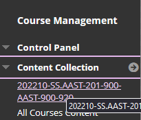 - Now that the course menu only contains the hidden course video link, look below under Course Management and click Content Collection to expand its menu. In most cases there will be a number directly under the words content collection which is the unique identifier for the target course. In some cases, mainly with merged super-sections, the ID will instead be the same or similar to the course name. Examples of both can be seen in the images below.